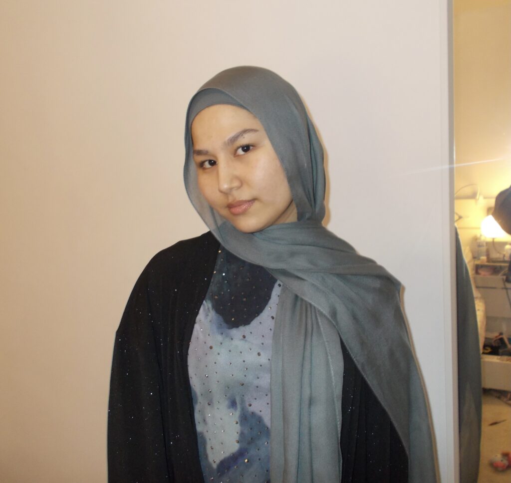A photo of a person wearing a pink hijab outside surrounded by greenery.
